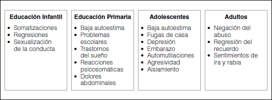 Aislamiento social, conducta regresiva, desconfianza relacional, conocimiento y/o práctica de conductas sexuales no propias de la edad, lenguaje sexual, masturbación excesiva, ser agresor de otros, delincuencia y uso de drogas, problemas escolares, etc. |